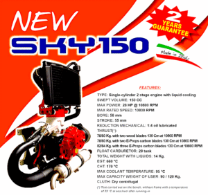 Generasi terkini FLYMECC – SKY150 menggunakan ‘SKY-ENGINE’ dengan volume silinder 150cc, mesin 2 stroke, menghasilkan daya dorong sebesar 78-80 kg. menggunakan propeler 3 blades berdiameter 130cm. dan tentunya dilengkapi sistem pendingin udara cairan (‘liquid cooled’) untuk menjaga kestabilan performa mesin khususnya untuk pengoperasian di daerah bertemperatur tinggi.